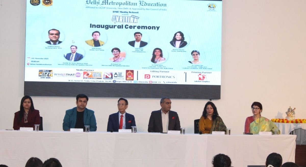 DME Collage Festival: डीएमई मीडिया स्कूल में सोमवार को वार्षिक मीडिया फेस्ट और सम्मेलन “वृत्तिका 2025” (Vritika 2025) की शुरुआत बड़े उत्साह के साथ हुई. यह कार्यक्रम नोएडा सेक्टर-62 के पास नेल्सन मंडेला ऑडिटोरियम में हुआ . इस साल वृत्तिका ने अपने 10 वें संस्करण में प्रवेश किया, जो छात्रों की क्रिएटिविटी और मीडिया कौशल को बढ़ावा देने के लिए जाना जाता है.