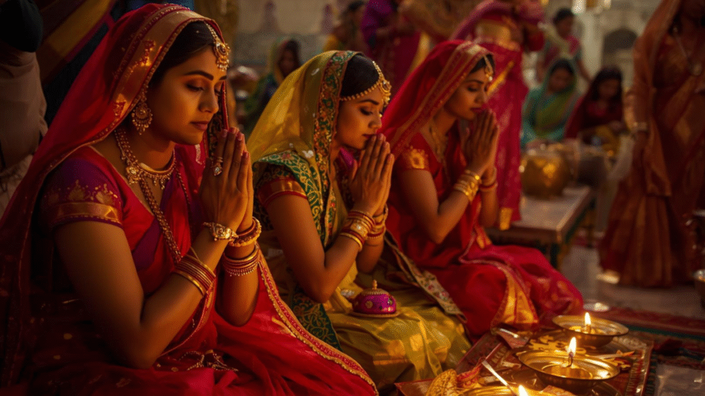 सोलह सिंगार, सुंदर वस्त्र पहने और मन में करवा माता का ध्यान करें
