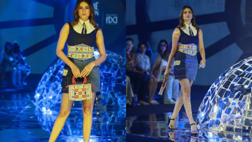 एक्ट्रेस ने लुक को और निखारने के लिए वाइट बेल्ट लगाई थी । हील्स और स्टाइलिश बैग के साथ रैंप वॉक पर चार चांद लगाए।